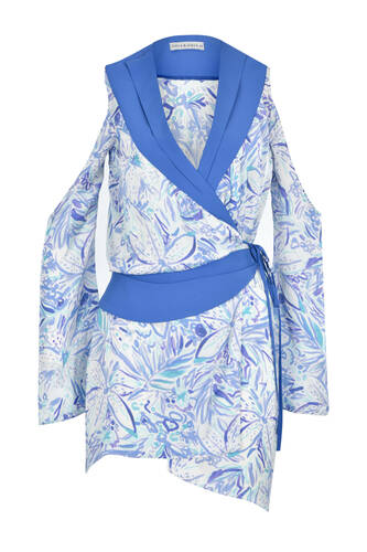 Mavi çiçeklerin ipeksi kruvaze elbiseyle buluşması..