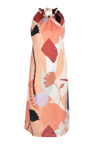Boyunda dikimli tahta boncuk aksesuar detaylıdır.